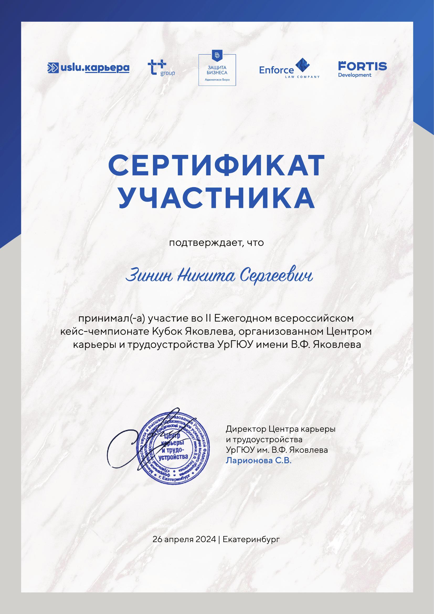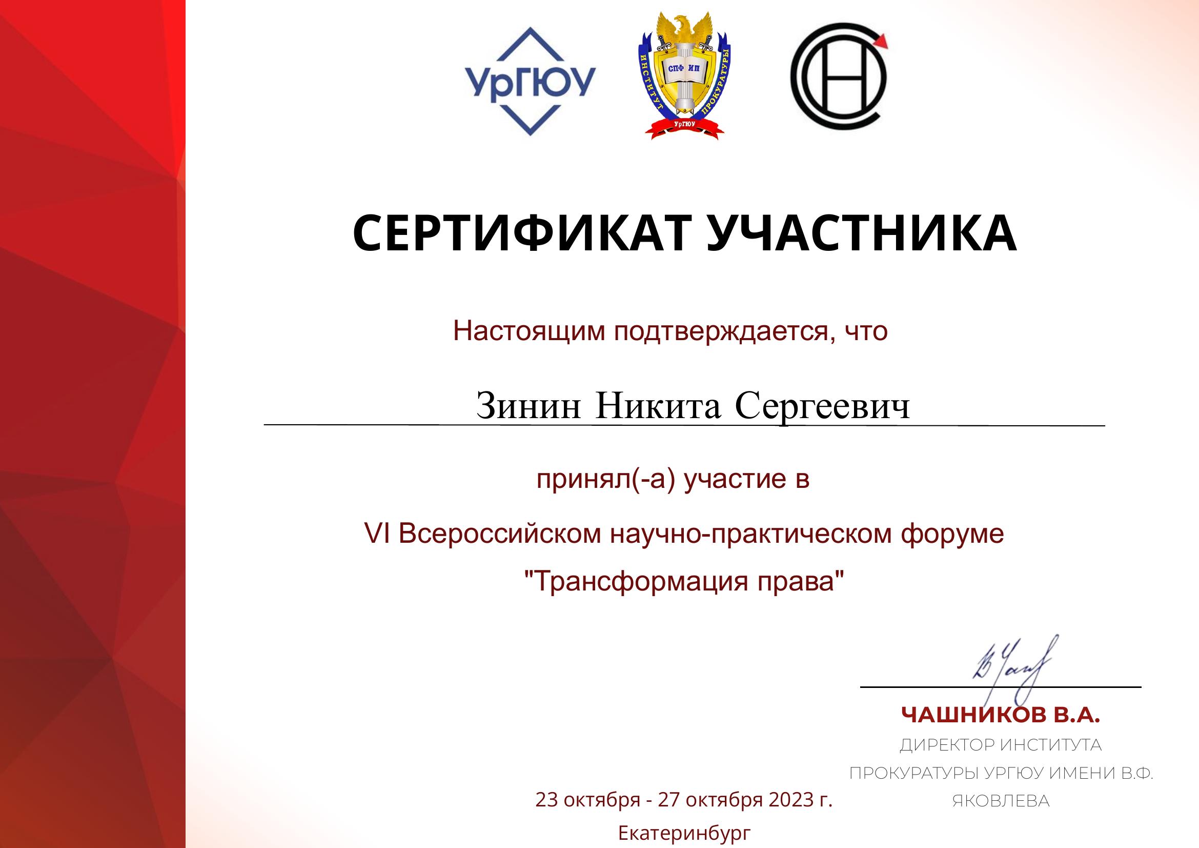 Наука – Зинин Никита Сергеевич помимо профессиональной деятельности активно занимается научной деятельностью (научные исследования, конференции и съезды молодых ученых), являясь аспирантом кафедры уголовного права им. М.И. Ковалева УрГЮУ им. В.Ф. Яковлева – является победителем всероссийского кейс-чемпионата «Уральские правовые дебаты» — 2025 уголовно-правового направления, участником, является автором ряда научных статей в области уголовного права, а также в настоящий момент занимается исследовательской деятельностью по вопросу неправомерного оборота средств платежей, соединяя это с адвокатской практикой.