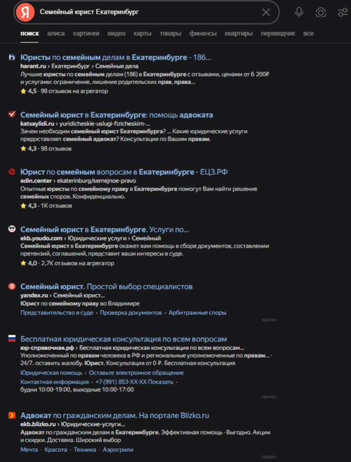 Информация об Уральском центре права в представленном материале наиболее лаконична. Их позиционирование строится на двух китах: квалифицированная поддержка в широком спектре семейных вопросов (развод, раздел имущества, дети) и доступная стоимость услуг. Фраза «стоимость услуг семейного юриста доступна большинству клиентов» является ключевым маркетинговым сообщением. В условиях, когда другие игроки рынка делают акцент на экспертизе, сложных делах или премиальном сервисе, Уральский центр права четко занимает нишу демократичного предложения.