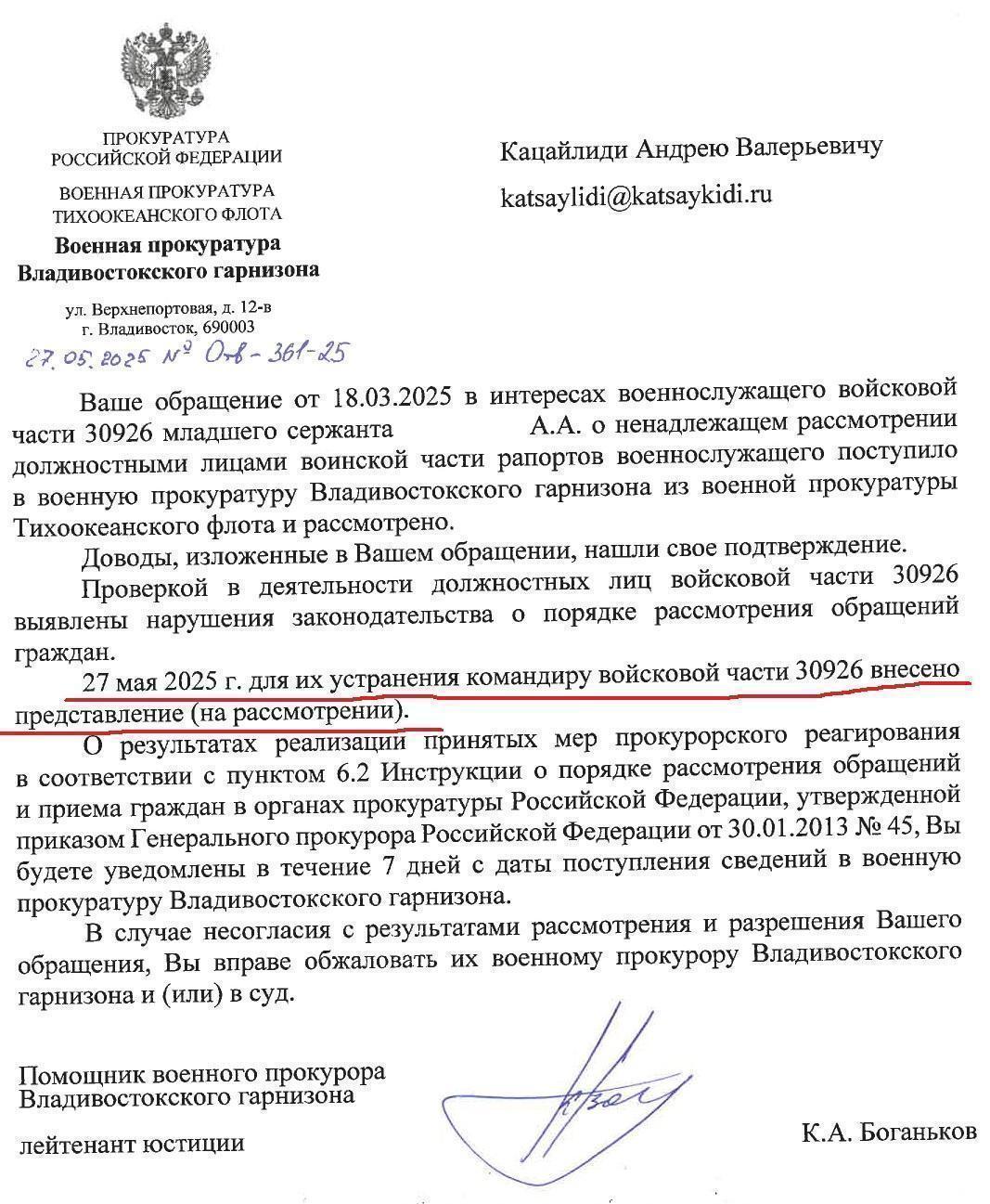 В частности, согласно официальному письму №ОФ-361-25 от 27.05.2025 г., подписанному помощником военного прокурора лейтенантом юстиции К.А. Боганьковым, в действиях должностных лиц части 30926 выявлены факты игнорирования рапорта, что является нарушением пунктов Инструкции, утверждённой приказом Генерального прокурора РФ №45 от 30.01.2013 года.