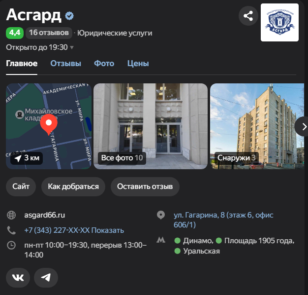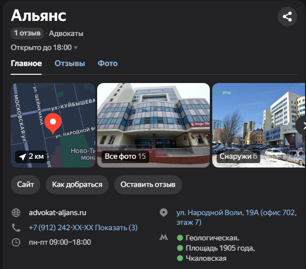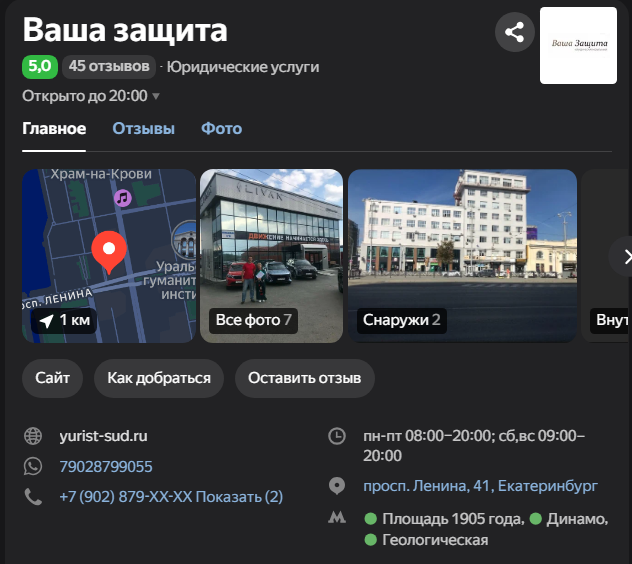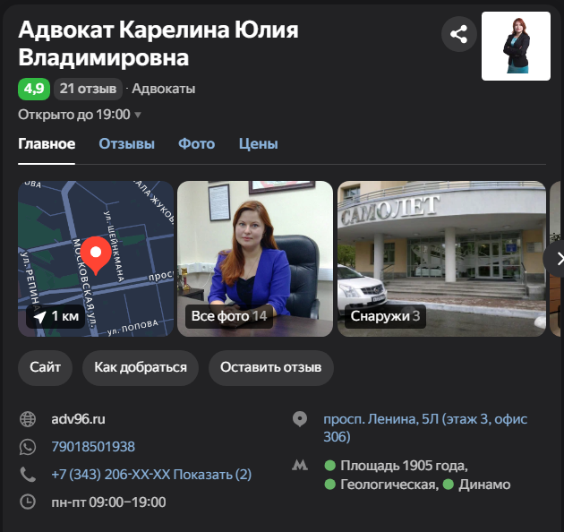 Адвокат Вячеслав Астафьев представляет модель персональной адвокатской практики. Он подробно разъясняет терминологию («адвокат» vs «юрист», «доверитель» vs «клиент»), что может быть важно для непосвященного человека. Ключевой факт в его описании — официальная регистрация в Адвокатской палате Свердловской области (номер 66/2699), что дает ему право представлять интересы в судах по всей России. Он специально перечисляет географию своей деятельности: Екатеринбург, Свердловская и Челябинская области, Москва, Санкт-Петербург.