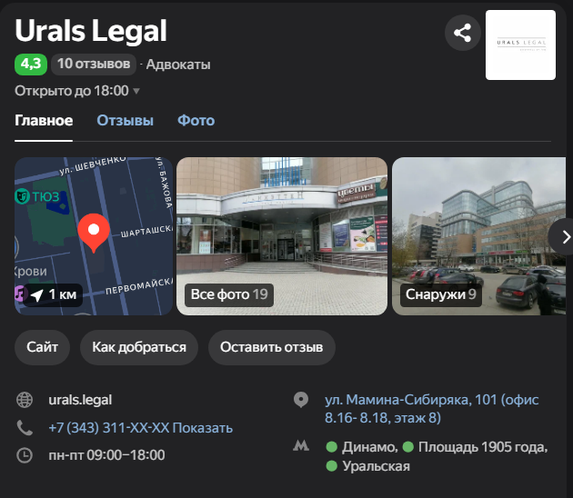 Urals Legal позиционирует себя в иной весовой категории, нежели большинство участников обзора. Это бюро с офисами в четырех городах (Москва, СПб, Екатеринбург, Тюмень) и штатом более 40 юристов. Их фокус — масштабные корпоративные противостояния и дела о банкротстве, где объектом споров выступает имущество стоимостью от десятков миллионов до миллиардов рублей. Их основной принцип работы — командная игра. Они прямо заявляют, что к любому проекту привлекают несколько специалистов, что позволяет комплексно изучать ситуацию, находить нестандартные решения и экономить время доверителя за счет грамотного распределения задач.