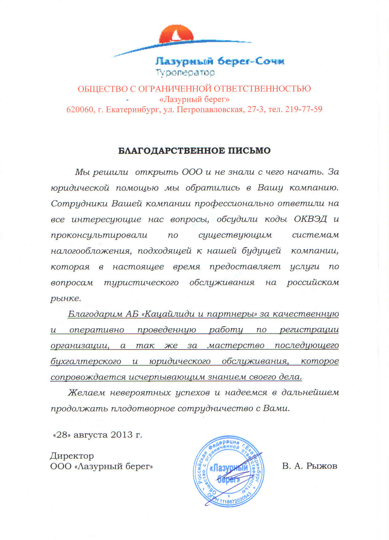 … «мы решили открыть ООО и не знали с чего начать. За юридической помощью мы обратились в Вашу компанию. Сотрудники Вашей компании профессионально ответили на все интересующие нас вопросы, обсудили коды ОКВЭД и проконсультировали по существующим системам налогообложения, подходящей к нашей будущей компании, которая в настоящее время предоставляет услуги по вопросам туристического обслуживания на российском рынке. Благодарим АБ «Кацайлиди и партнеры» за качественную и оперативно проведенную работу по регистрации организации»…